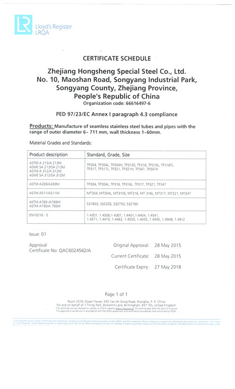 2015年5月10日至13日,LR(Lloyd'sRegisterofShipping)審核組一行來到浙江宏盛特鋼有限公司生產現場,對宏盛特鋼質保體系、生產能力及產品檢測能力等一一進行了現場審核。并對公司TP304材料、MT304材料、S32205材料不銹鋼管現場取樣,見證了化學成分、機械性能、超聲波探傷等型式實驗。經過多項審核,各項指標均符合PED4.3相關要求。通過為期三天的審查,LR審核組對宏盛特鋼的質保體系及生產能力給予了高度的肯定,同時公司也順利取得由勞氏頒發的PED97/23/EC4.3證書。